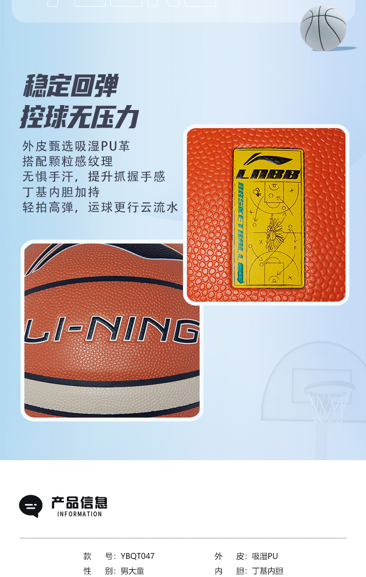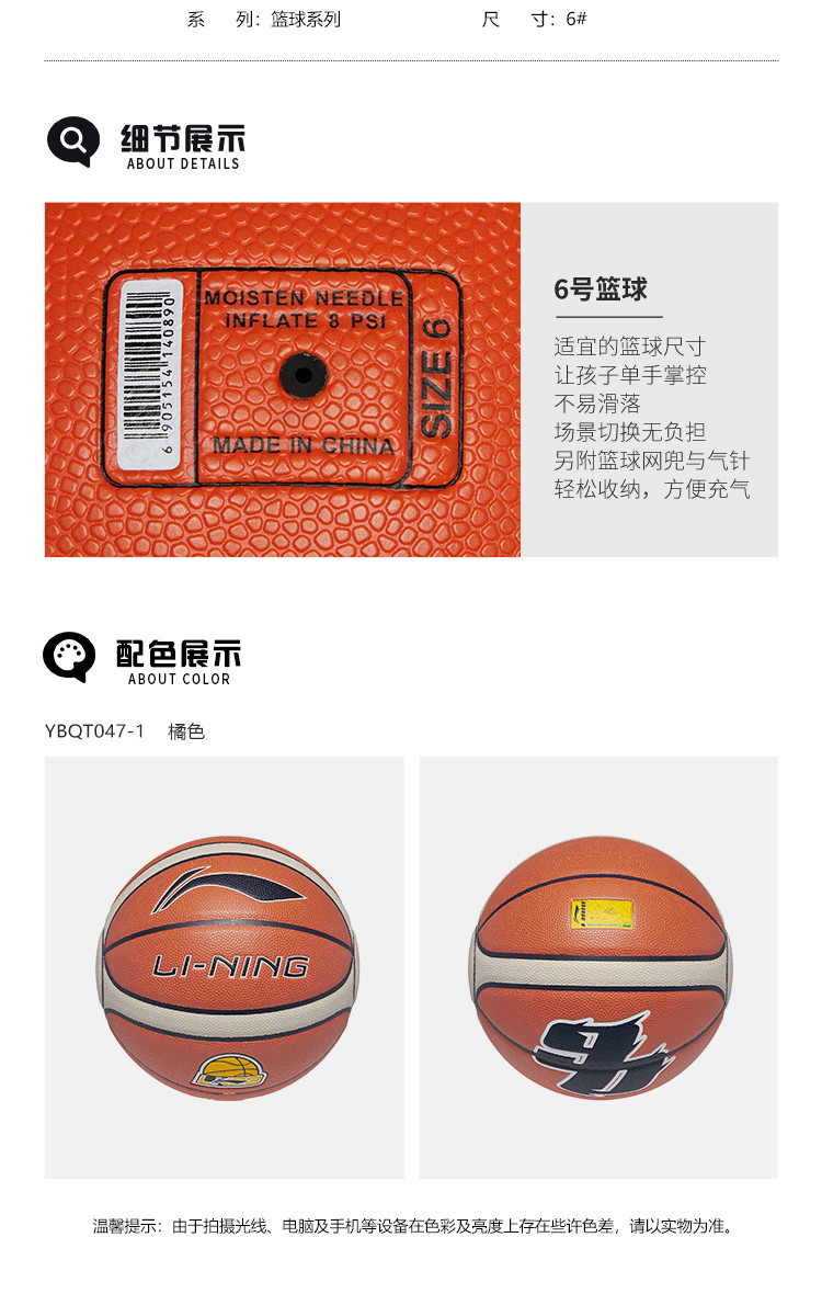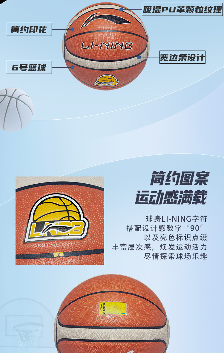 | 篮球规格: | 6号球 | 篮球材质: | 外皮:吸湿PU 内胆:丁基内胆 |