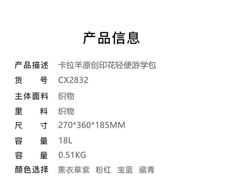 | 商品卖点: | 大容量多隔层轻便原创 | 商品款号: | CX2832/CX5487 |